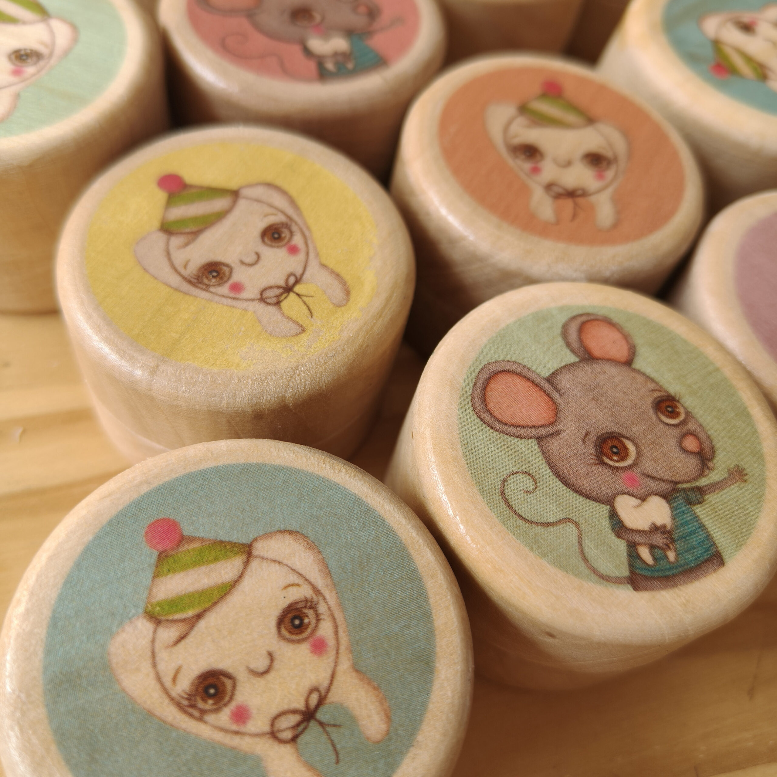 Las ilustraciones están elaboradas a mano con lápices de colores, y luego transferidas directamente sobre la madera de forma artesanal.