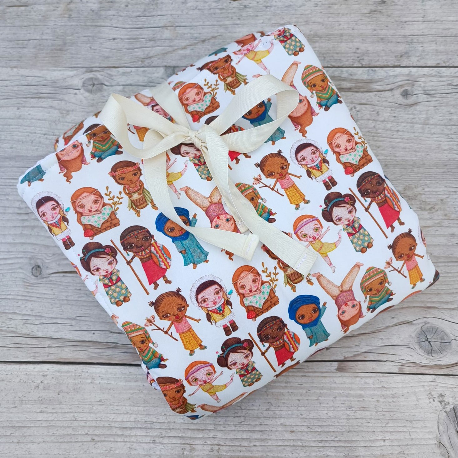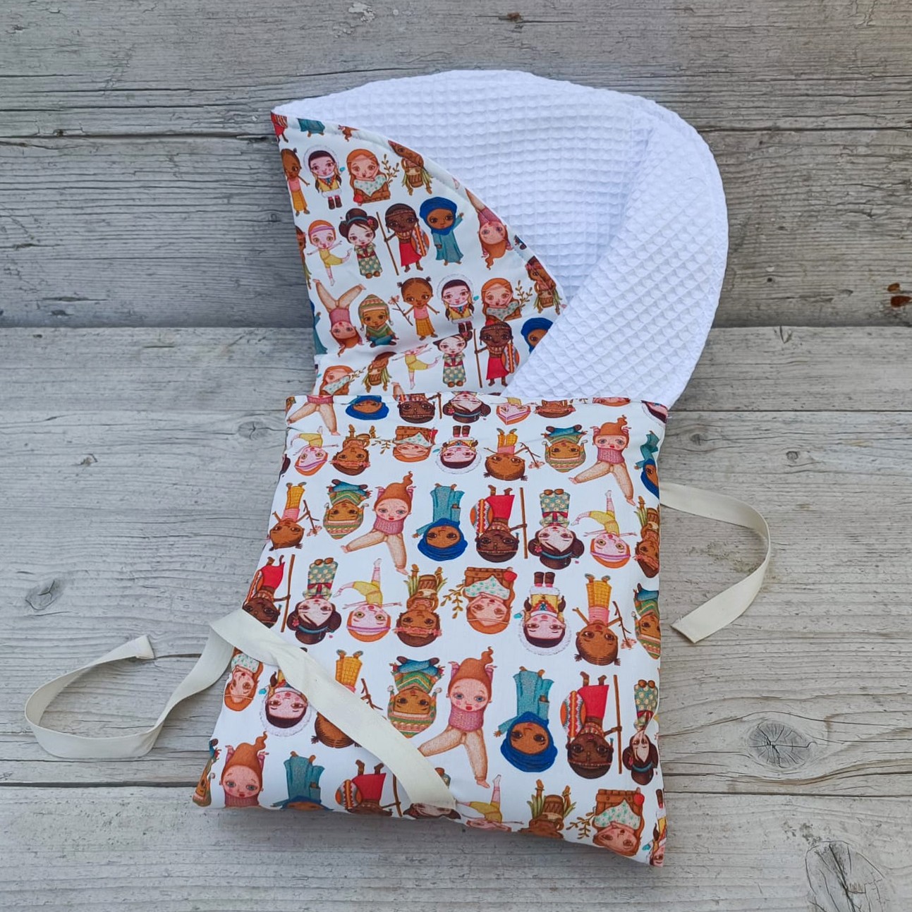 Muy práctico para llevar en la bolsa del cochecito, fácil de plegar. Se ata mediante una cinta.