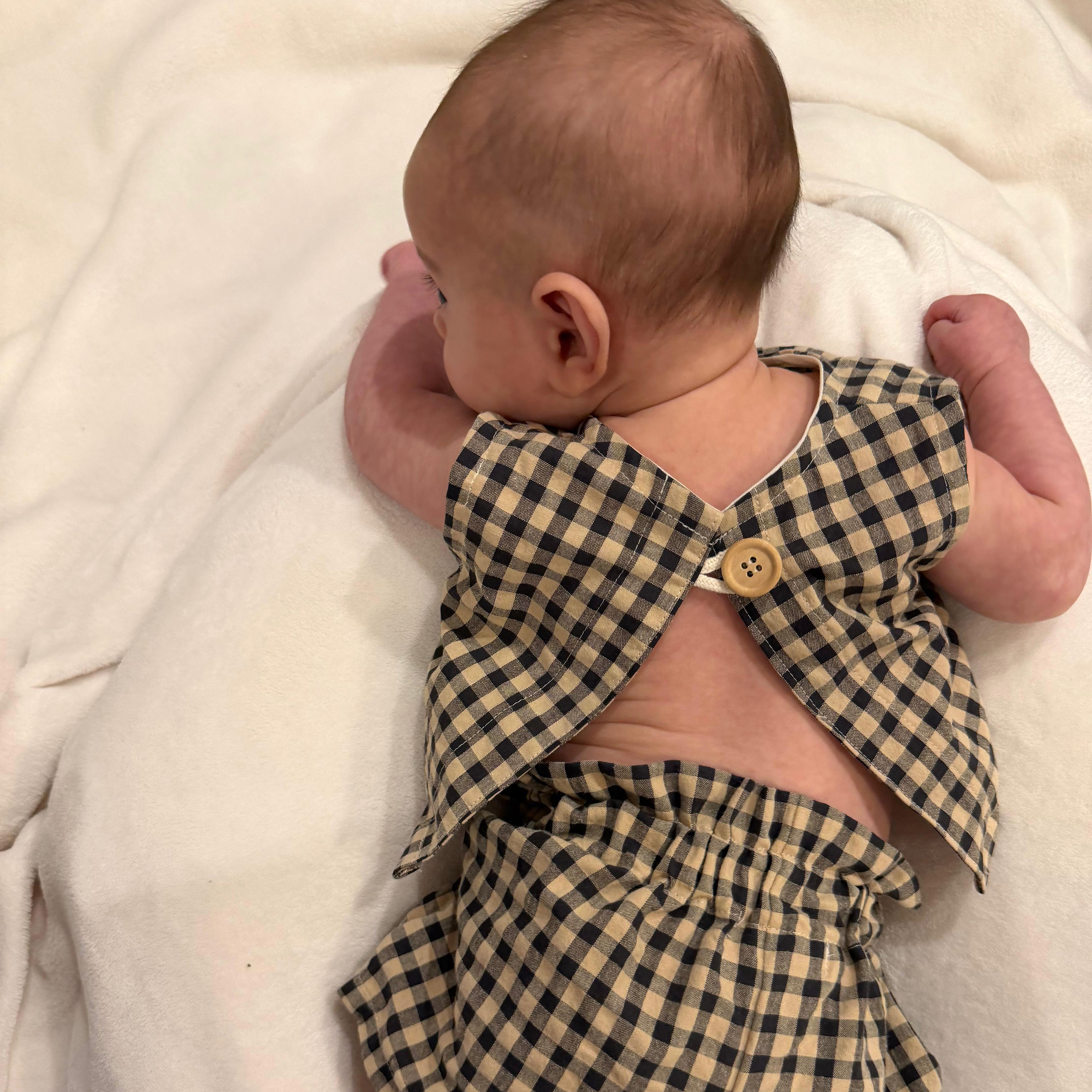 Está confeccionado en tejido de algodón de cuadraditos Vichy, disponible en varios colores. El top presenta la espalda abierta y se cierra en la parte superior mediante un botón de madera, quedando la parte inferior de la espalda abierta como detalle del diseño. El short es de tiro ligeramente alto y cuenta con cinturilla fruncida con goma flexible, que se adapta cómodamente sin apretar.