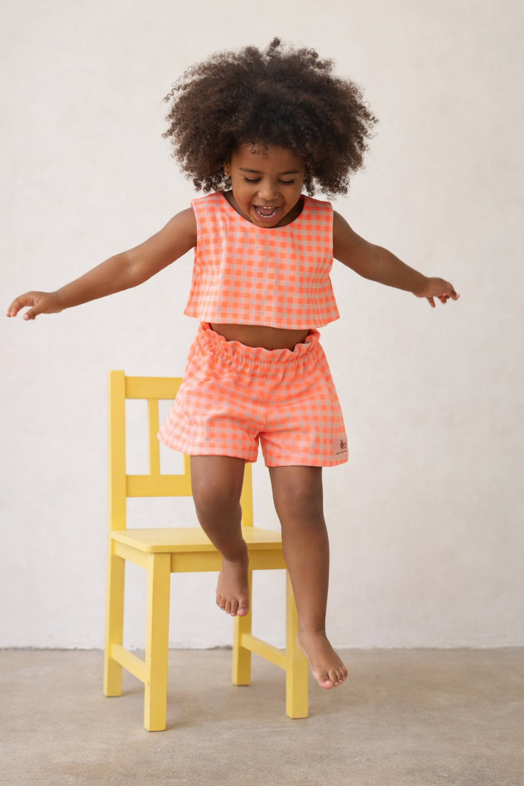 Conjunto infantil de verano compuesto por top y short, pensado como una opción fresca y cómoda para los días más cálidos. Un conjunto ligero, fácil de llevar y perfecto para el uso diario.