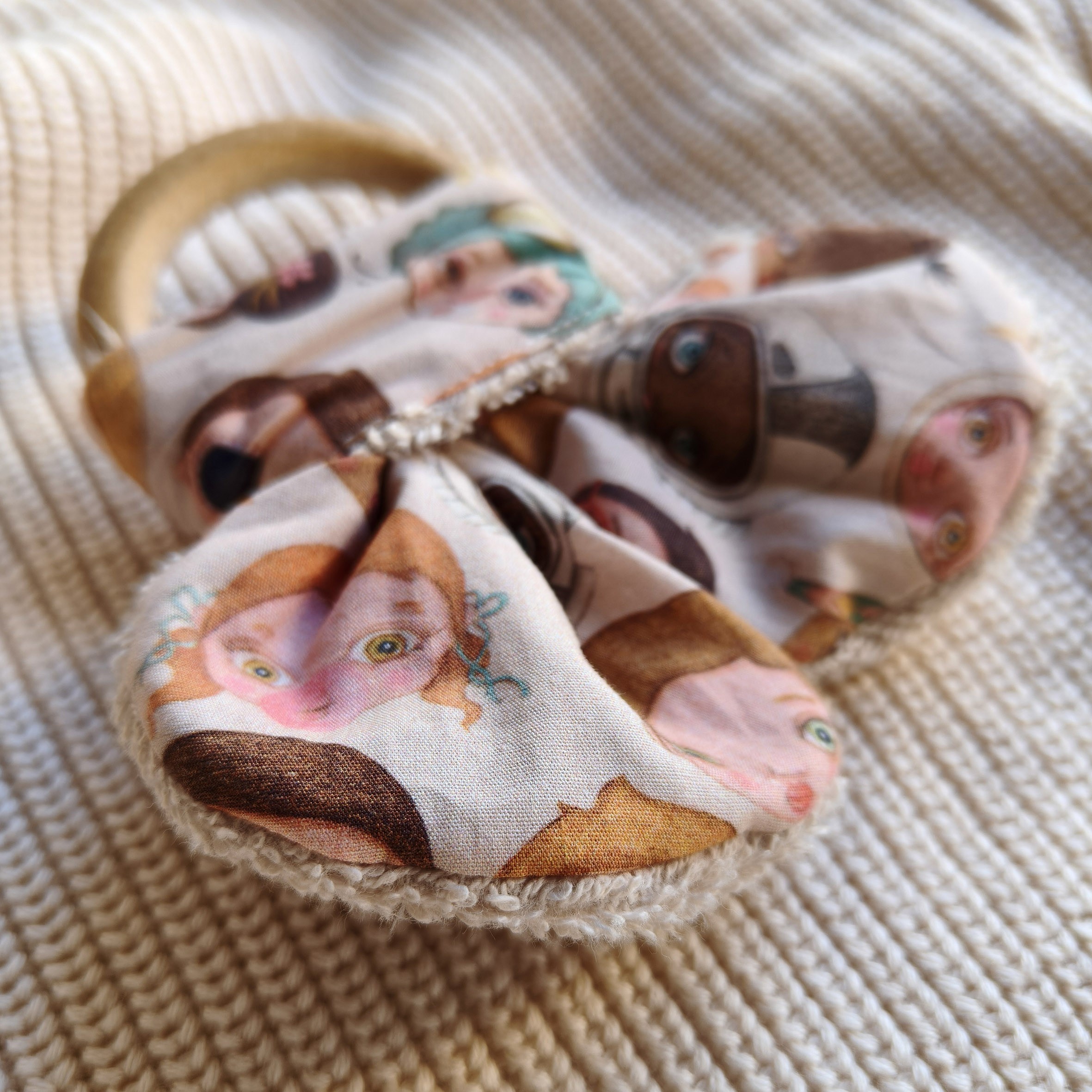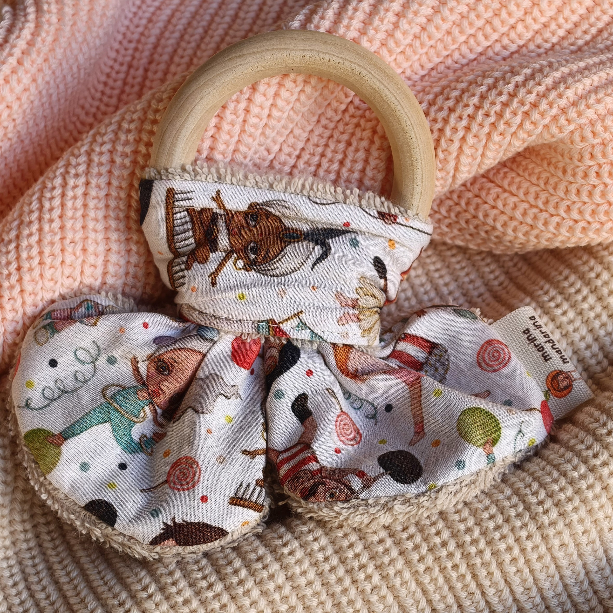 Mordedor para bebé, con forma de orejitas, elaborado con tejido de algodón orgánico estampado y con reverso de toalla de color beige, con argolla de madera natural de arce.